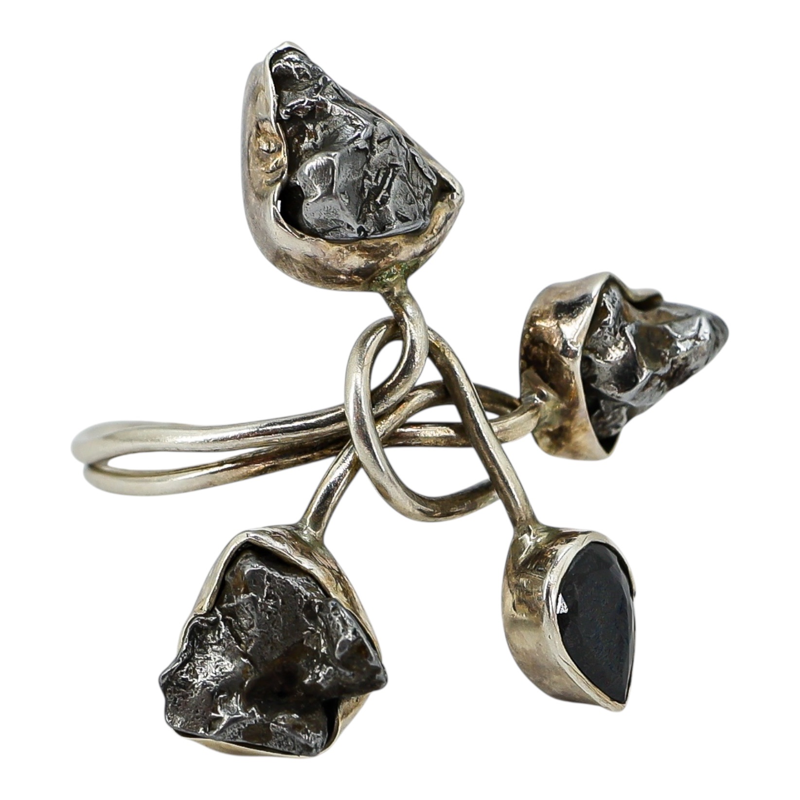 Sculptural sterling silver ring featuring an organic, freeform design set with a mix of raw and faceted natural stones. The composition uses rough, uncut dark stones paired with a polished faceted accent, creating strong contrast and architectural depth.
