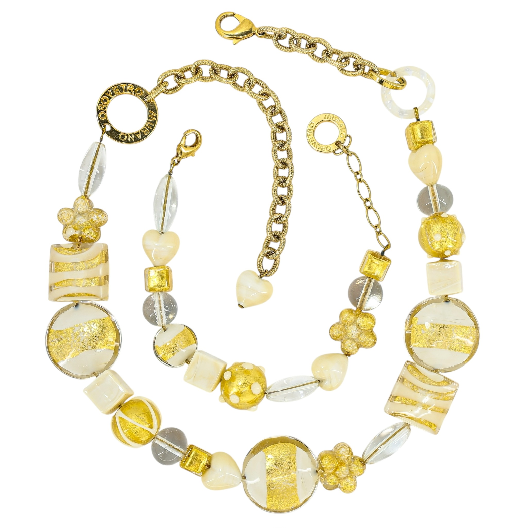 Elegant signed Orovetro Murano art glass necklace and bracelet set featuring a mix of hand-crafted beads with gold foil inclusions. The design combines round, cube, floral, and heart-shaped beads in luminous shades of white, ivory, and gold, accented with clear crystal spacers. Each bead showcases the signature Venetian layering technique that gives Murano glass its depth and shimmer.