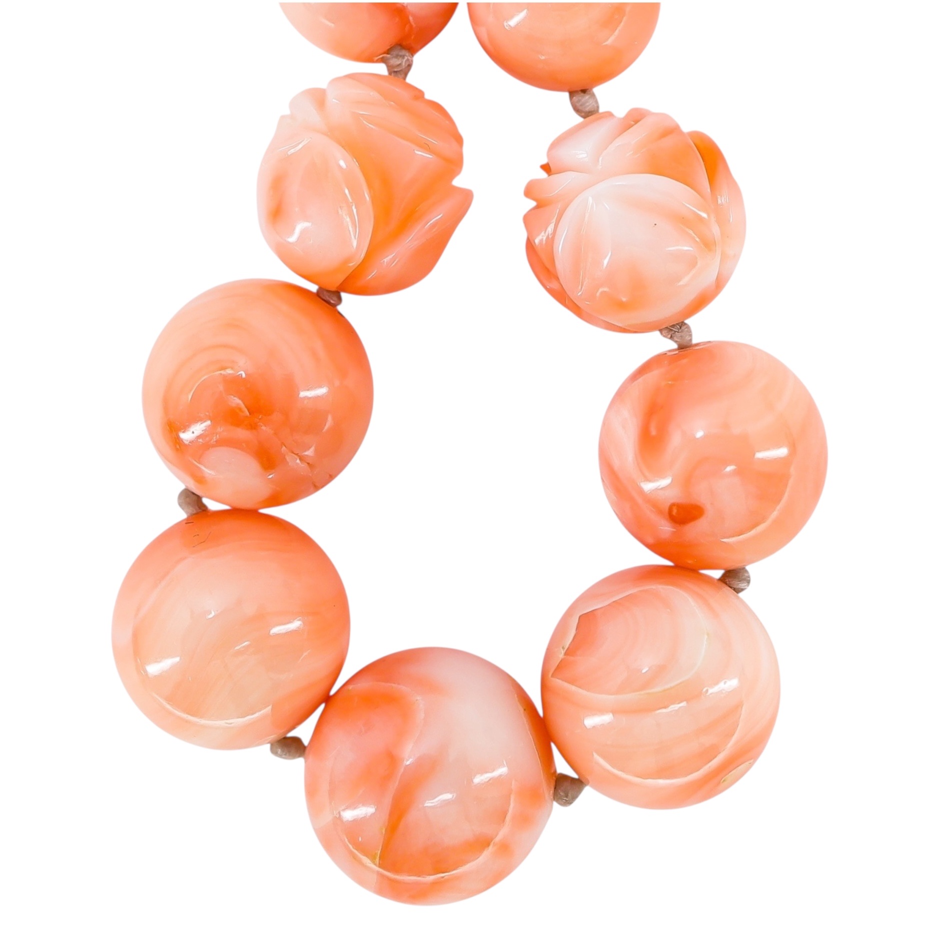 Finished with a vintage sterling silver fish-hook clasp, the strand has no cracked drill holes or filler, only the natural swirls typical of genuine Corallium elatius.