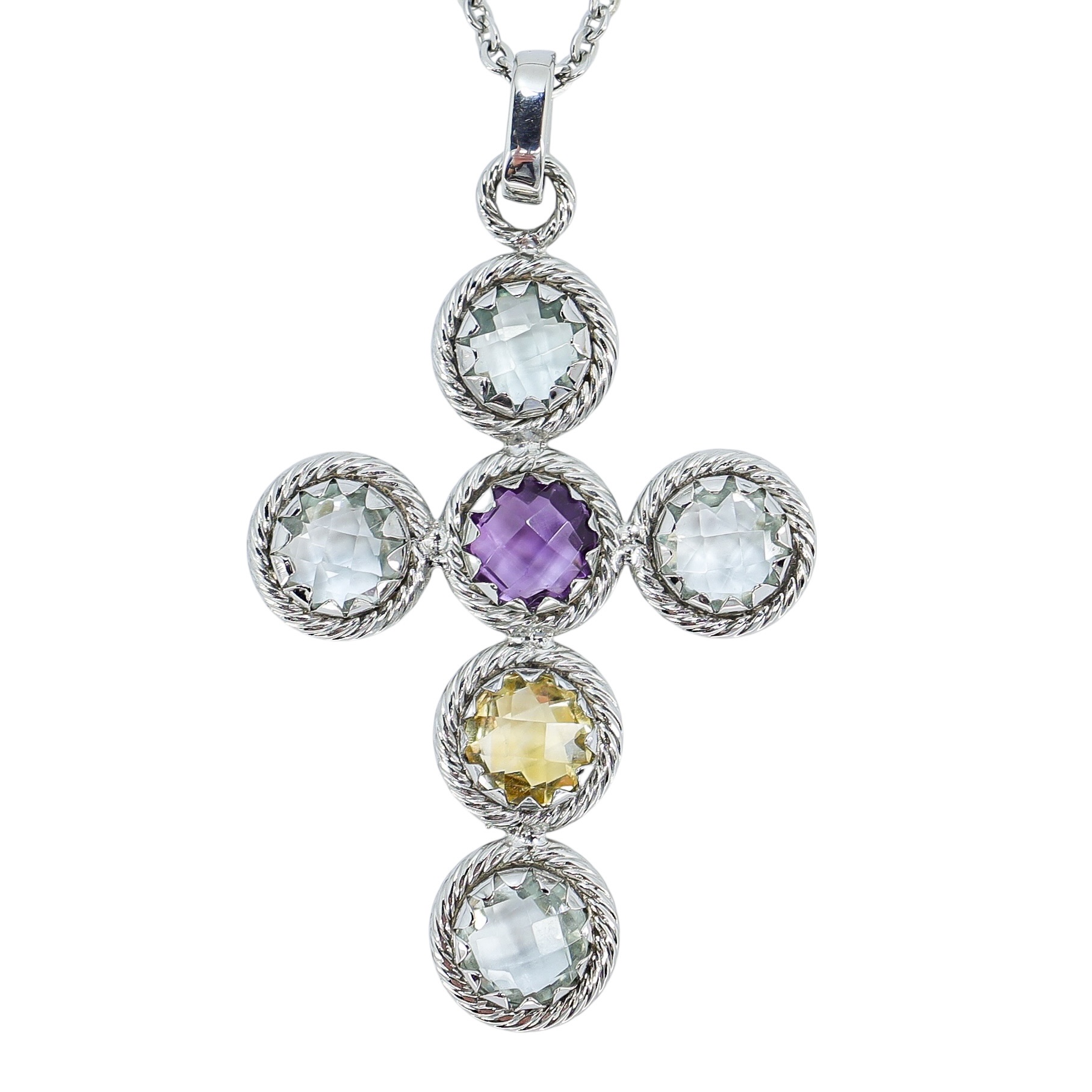 Elegant cross pendant necklace crafted in polished stainless steel and set with faceted pastel glass stones in soft aqua, lavender, and pale yellow tones. Each stone is mounted in an open-back prong setting with rope-twist bezels, allowing light to pass through for added brilliance.