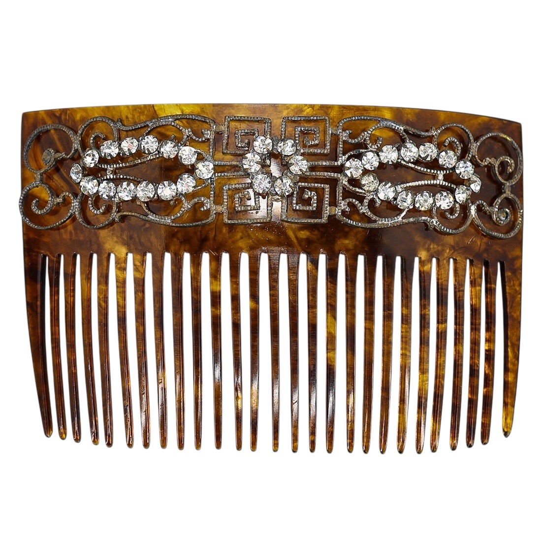 Elegant authentic vintage 1930s Art Deco hair comb, crafted from faux tortoise acetate and accented with a stunning Greek key and scroll motif set with sparkling clear rhinestones. The deep amber and honey tones of the celluloid/acetate base highlight the brilliance of the stones and fine metalwork, creating a truly eye-catching accessory.