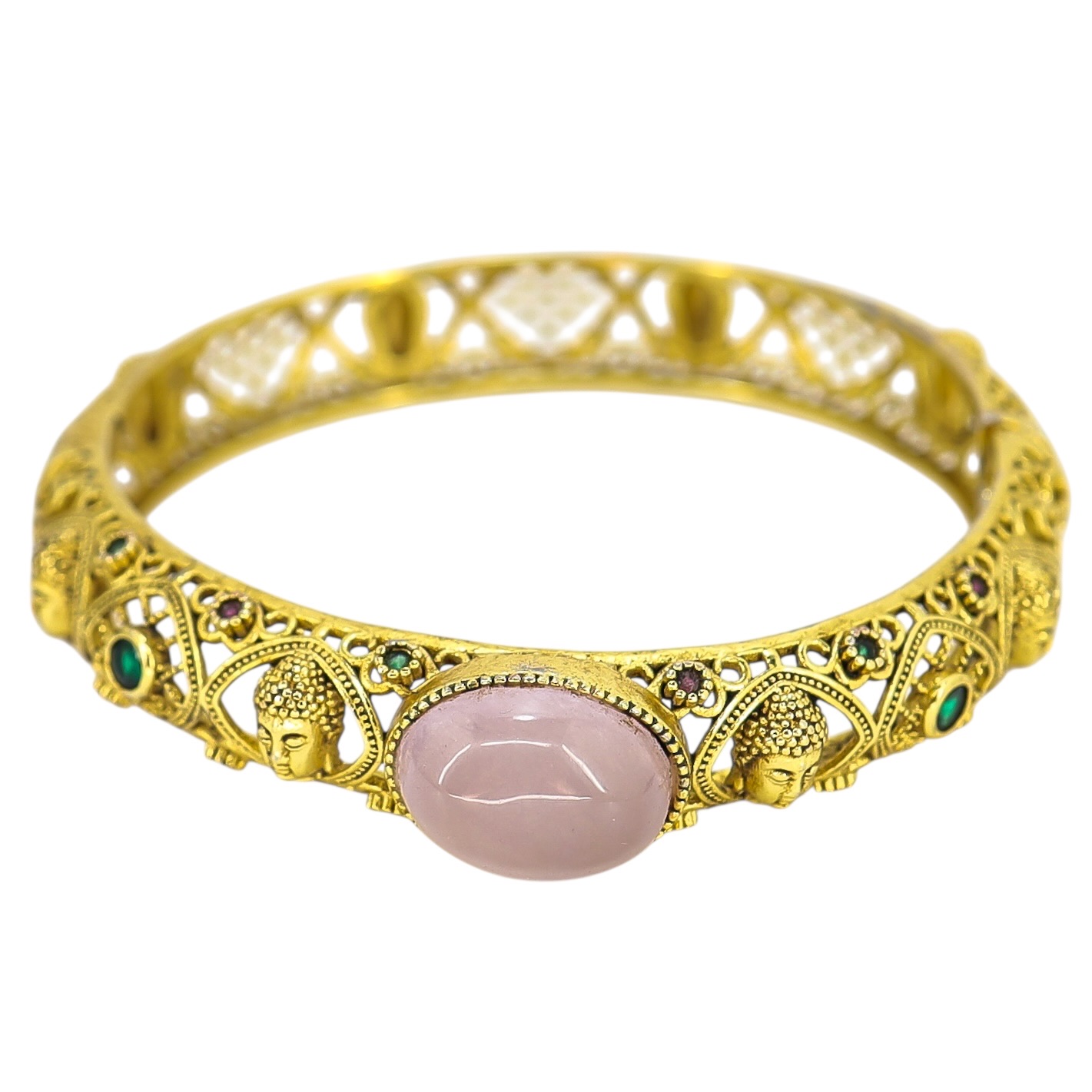 The bracelet features a large oval pink hardstone cabochon at the front, surrounded by small colored accent stones set into ornate scrollwork. The detailed Buddha faces, pierced design, and warm gilt finish are characteristic of Asian revival pieces made for the export market in the 1950s–1970s.